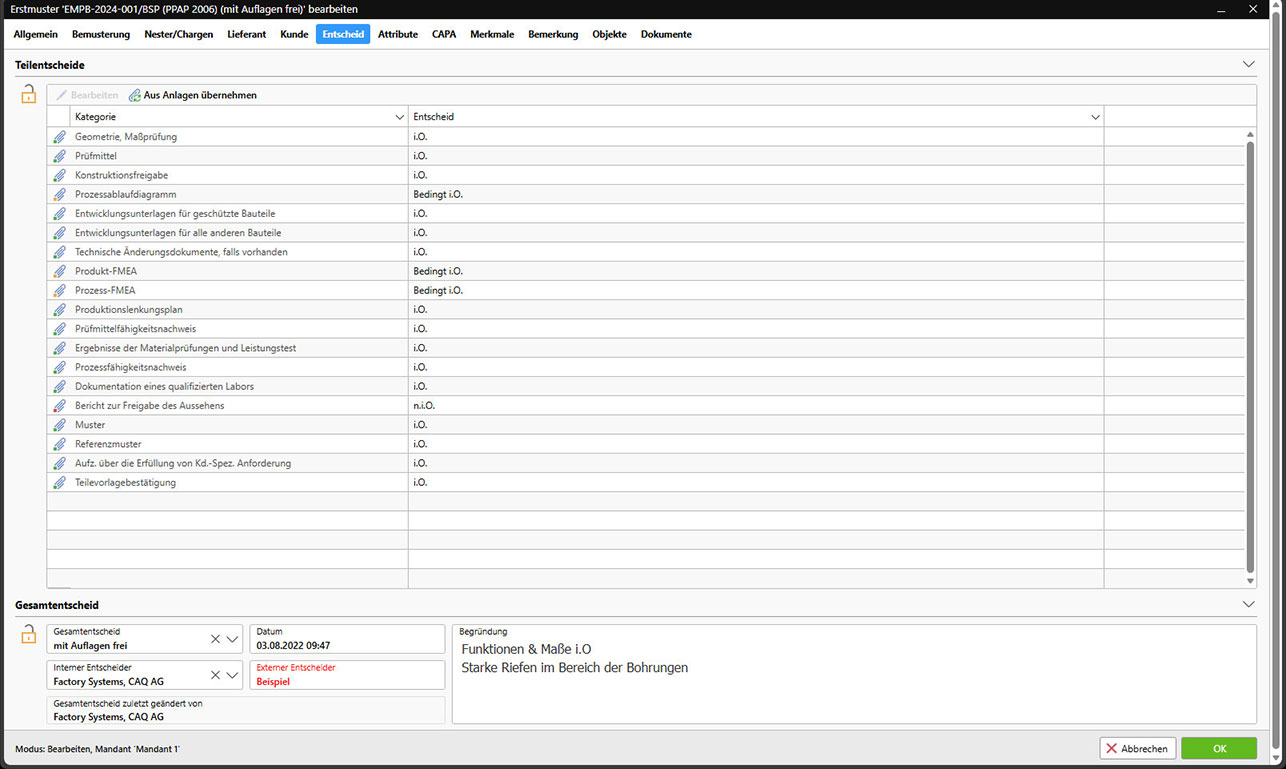 Ja. Die Software unterstützt die AIAG-PPAP-Vorgaben, VDA-Anforderungen, IATF 16949, DIN EN 9102 und QS 9000. Entsprechende Bemusterungsarten mit definierten Vorlagestufen und Reports sind bereits integriert und können individuell angepasst werden – auch für kunden- oder länderspezifische Freigabeformate.